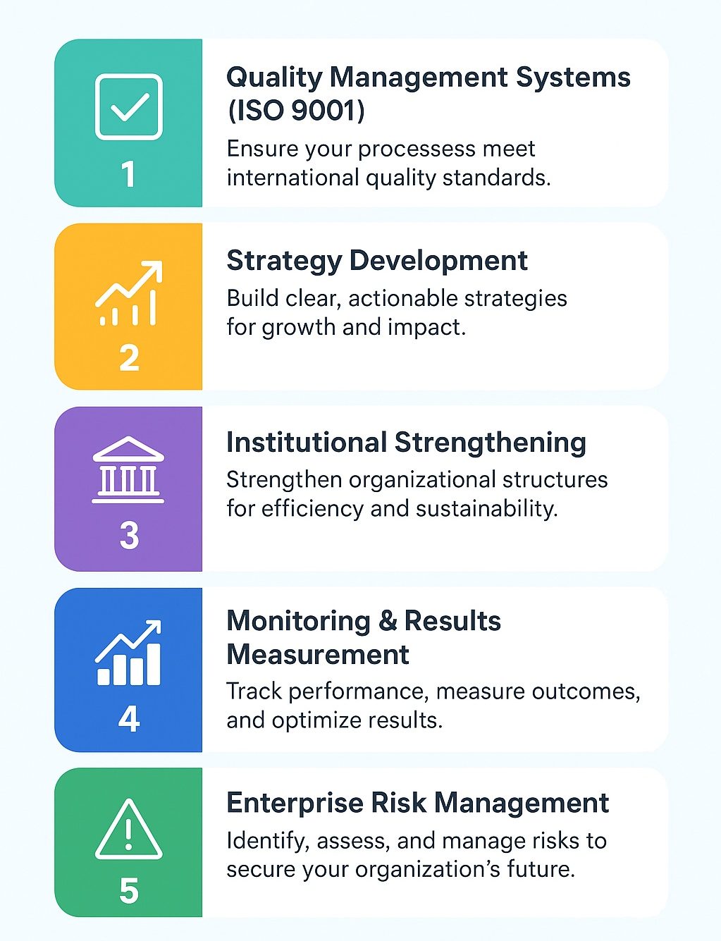 We support institutions operating in complex environments where accountability, consistency, and credibility matter. Our work spans quality management, enterprise risk, strategy execution, governance, and institutional capacity building.